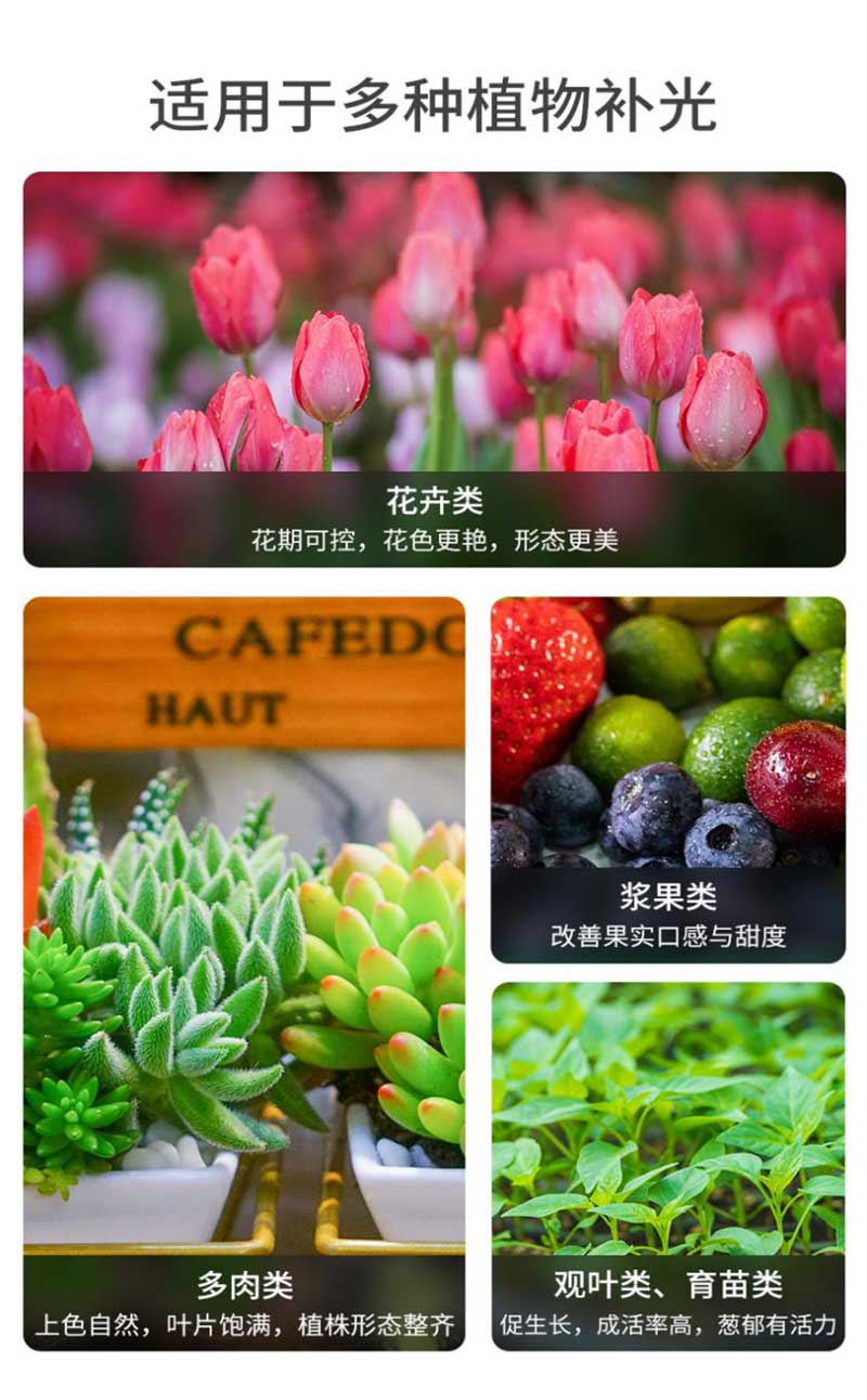 紅藍光譜植物(wù)生長(zhǎng)燈光譜包含紅光光譜和藍光光譜,而全(quán)光譜植物生長燈則是模擬太陽光,光譜接近太陽光,包含赤、橙、黃(huáng)、綠、青、藍、紫不同光譜,適用於多種植物補光,