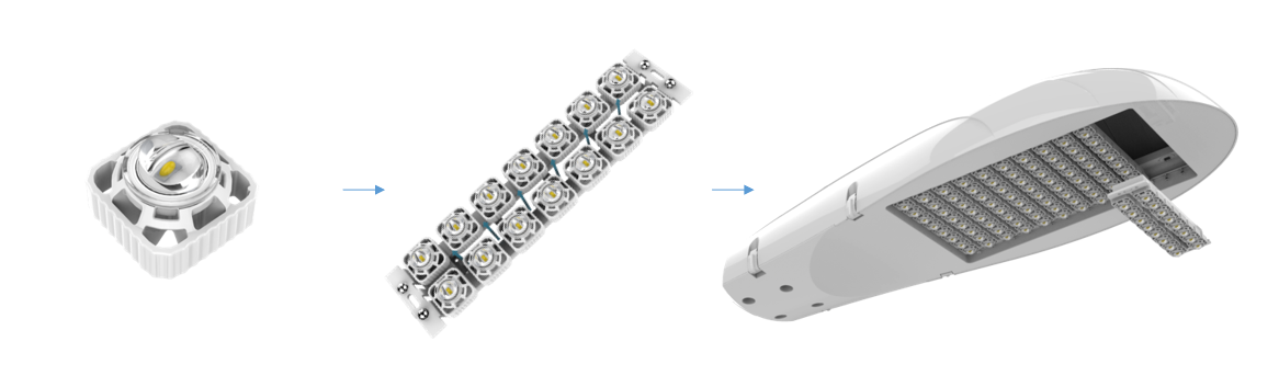 LED芯片(piàn)自封裝→單顆像素的光學設計,並成獨(dú)立(lì)發光體(獨立像素(sù)發光)→多顆像素組合成發光模組→根據應用環境需求配置不同功率的成品路燈頭