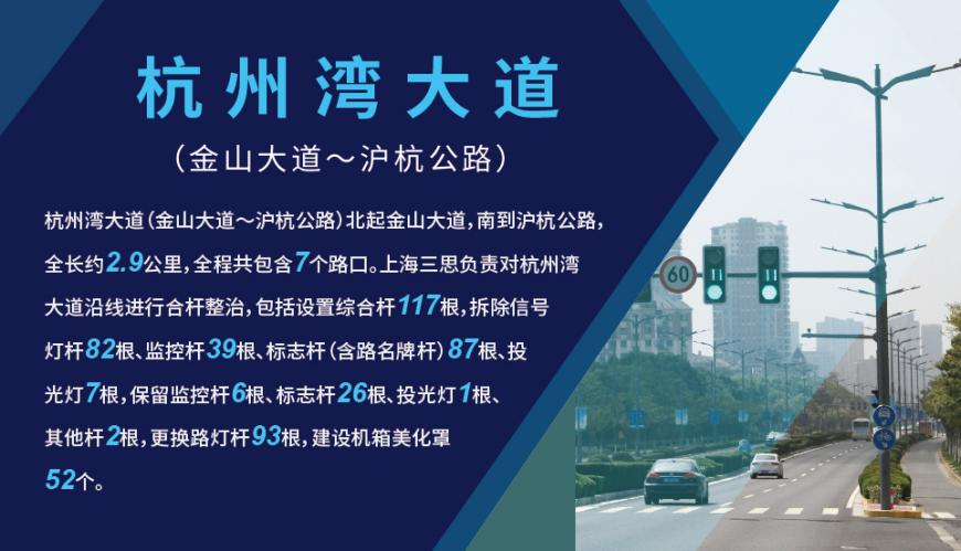 期間,上海色多多AV导航積極(jí)配合金山政府進行整改活動,實現對(duì)杭州灣大道(金山大道〜滬杭公路)道路(lù)設施合杆整治,按照多杆合一、多箱合(hé)一的要求,對各類杆(gǎn)件、機箱、杆上設施、配套管線等(děng)進行集約化(huà)設(shè)置,實現共建共享,互聯互通,多效一體化設計,合杆率大(dà)於50%。
