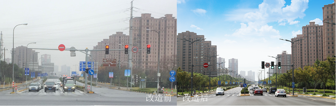 經過各部門(mén)的共同努力,杭州(zhōu)灣大道上林立的各式(shì)路名牌、信號燈等杆件逐漸合並(bìng),煥然一新,達到了“線清、杆合、景美”的效果。