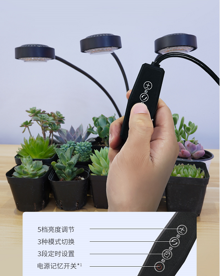 通過線上控製器,燈亮狀態下,短按分別開啟 3/6/12 小時倒計時,當(dāng)倒計時結束後,燈(dēng)具將自動關閉,出(chū)門忘記(jì)關燈再也不怕(pà)不怕了;不管家裏種(zhǒng)的是喜陽植(zhí)物,還是喜陰植物,通過5檔亮度調節,可以選擇合適光照;通過3種模式靈活切換,植物苗期、生長期、開花期、結(jié)果期(qī)不同光照需求,一盞燈就可以輕鬆搞定;想要打開之後的燈保持關閉前的亮燈狀態,通過(guò)電源(yuán)記憶開關就可以實現啦,同時每按電源記憶開關(guān)一次即可關閉一個(gè)燈,按鍵3次(cì)後,3個燈全部關閉。
