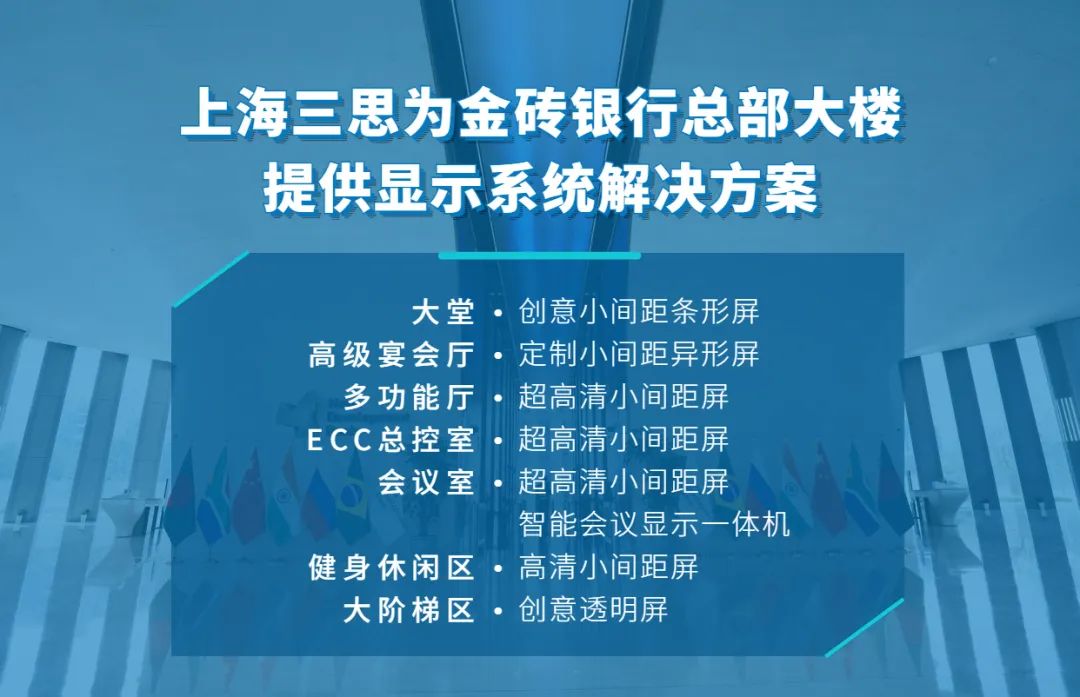 經(jīng)過層層(céng)篩選,上海色多多AV导航依托於(yú)雄厚(hòu)的綜合實力與豐富的(de)項目(mù)經驗,成為金磚銀行總部大樓顯示(shì)屏及係統綜合供應(yīng)商——為總部大(dà)樓提供LED顯(xiǎn)示全方位係統解決方案,應用產(chǎn)品涵蓋條形屏、全彩屏、弧形屏、透明屏、會議顯示一體機等多品類LED顯示屏及係統,讓(ràng)綠色、科技、藝術(shù)在這座地標名築中得到充分展現。
