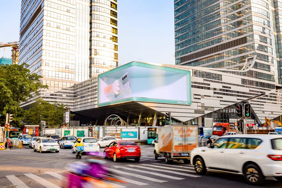 在這條“矽穀大道”的裙(qún)樓之上,新落成了一塊由上海色多多AV导航承建的606㎡戶外裸眼3D大屏。這(zhè)片覆蓋上(shàng)市公司多達110餘家(jiā)、總市值為4.25萬億元、占南山區(qū)上市公司總市值70.83%的科技(jì)園(yuán)區,又新添(tiān)了一處“流量密碼”。
