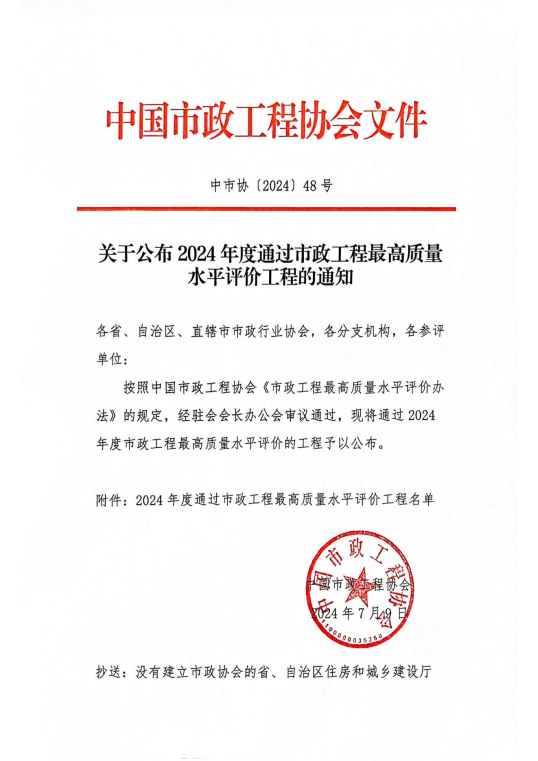 市政工程最高質量水平評價(原中國市政金杯示(shì)範工程)由中(zhōng)國市政工程協(xié)會組織實施,是市政工程行業在工程質量方麵最高的質量水平評價,代表市政(zhèng)工(gōng)程行業同時期國內先進水平。